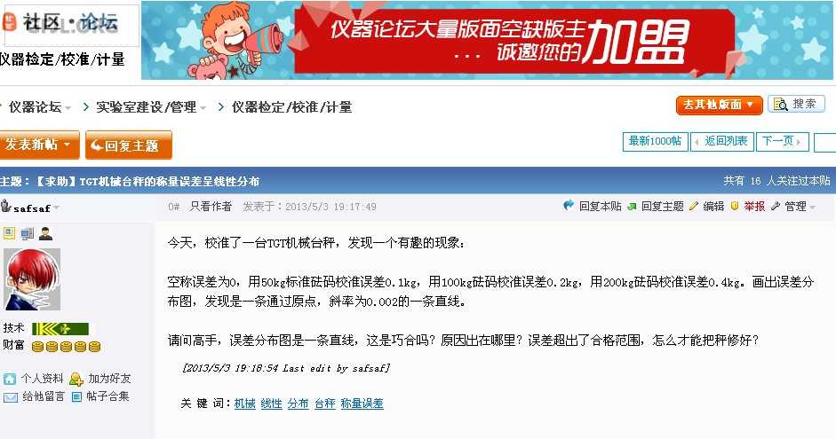 本帖最后由 流連 于 2013-5-6 20:05 編輯 哈哈哈哈。樓上的腦筋非常聰明,分析的調整也很對。 但是那個圖完全不是那么回事,如果這樣,豈不是秤量的物體堆放位置離“調整點”越近越重嗎? 機械秤的線性在任何情況下肯定是一直線,不可能是折線的,樓主是少見多怪了。和電子秤不一樣的。 如果出現誤差,只是斜率不對了,誤差成正比增大,只要調整“調整點”位置的力點刀就可以了,那個力點刀是可以用扳手轉動的。 |