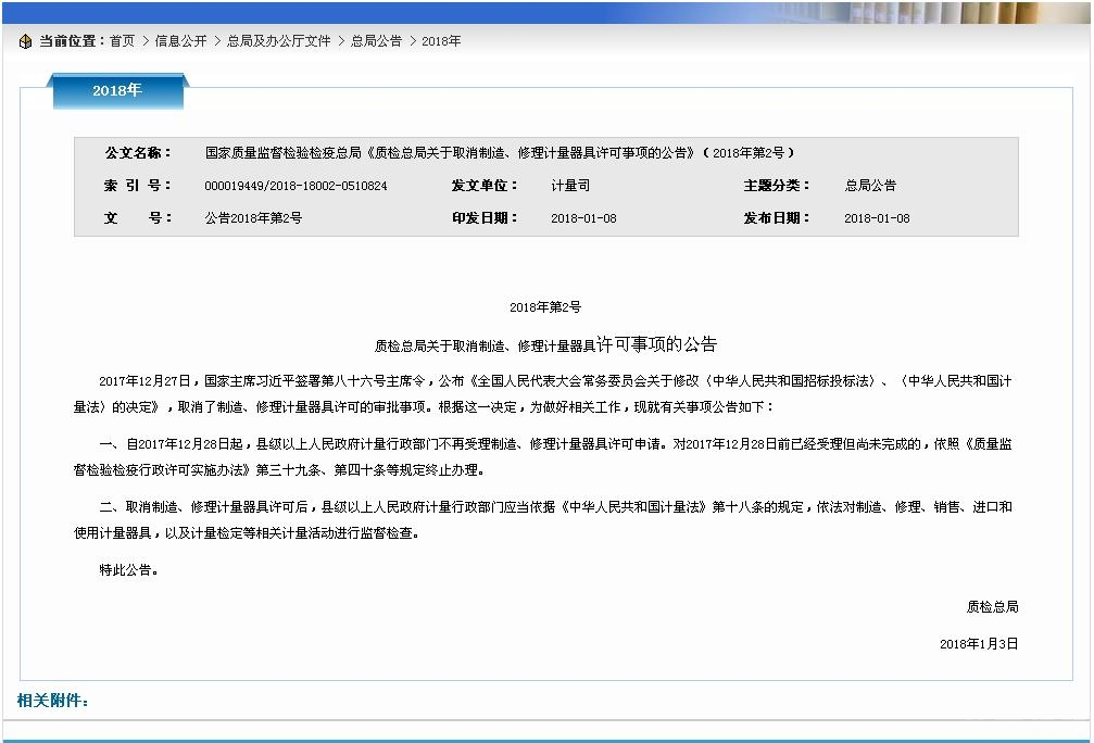 正文摘要:2018年第2號 質檢總局關于取消制造、修理計量器具許可事項的公告 2017年12月27日,國家主席習近平簽署第八十六號主席令,公布《全國人民代表大會常務委員會關于修改〈中華人民共和國招標投標法〉、 ... |