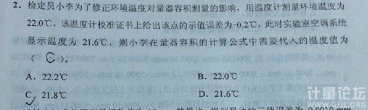 | 示值誤差與修正值相反,所以修正值為+0.2℃,故代入溫度值應為:22.0+0.2=22.2℃ |