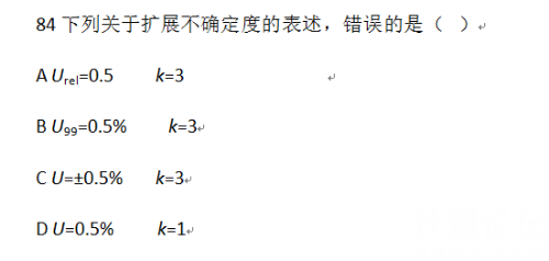 劉耀煌 發表于 2018-6-14 16:50 A、B、C、D都不正確,D 選項 k=1等于沒擴展,A選項Urel是相對不確定度 , 但數值沒用百分比形式; C選項 U的 ...