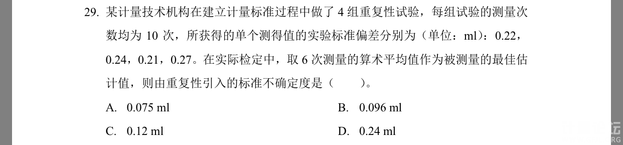 本帖最后由 湖民 于 2019-6-10 18:23 編輯 1、按合并樣本偏差做 合并樣本偏差s=sqrt( (0.22^2*(10-1)+0.24^2*(10-1)+0.21^2*(10-1)+0.27^2*(10-1) ) / 4*(10-1) )≈0.236 6次測量平均值的s=0.236/sqrt(6)≈0.096 答案選B 2、按uc做,可以看2樓。 |