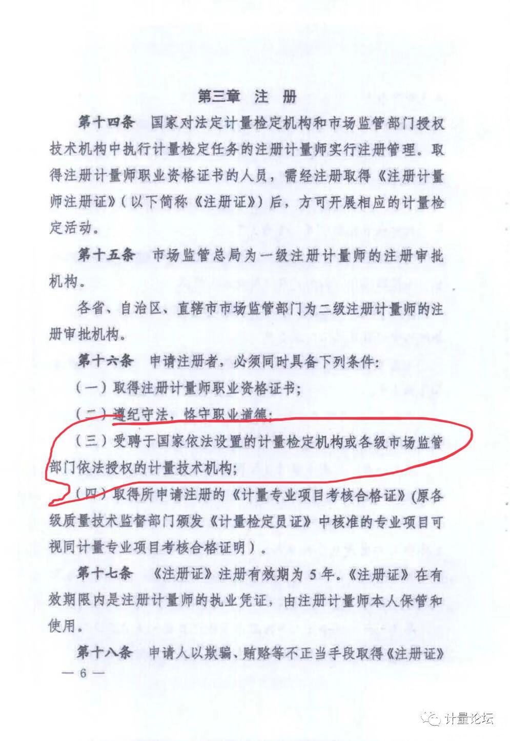正文摘要:根據10月16日新出臺的《注冊計量師職業(yè)資格制度規(guī)定》; 第十六條 申請注冊者,必須同時具備下列條件: (三)受聘于國家依法設置的計量檢定機構或各級市場監(jiān)管部門依法授權的計量技術機構; 企業(yè)內部 ... |