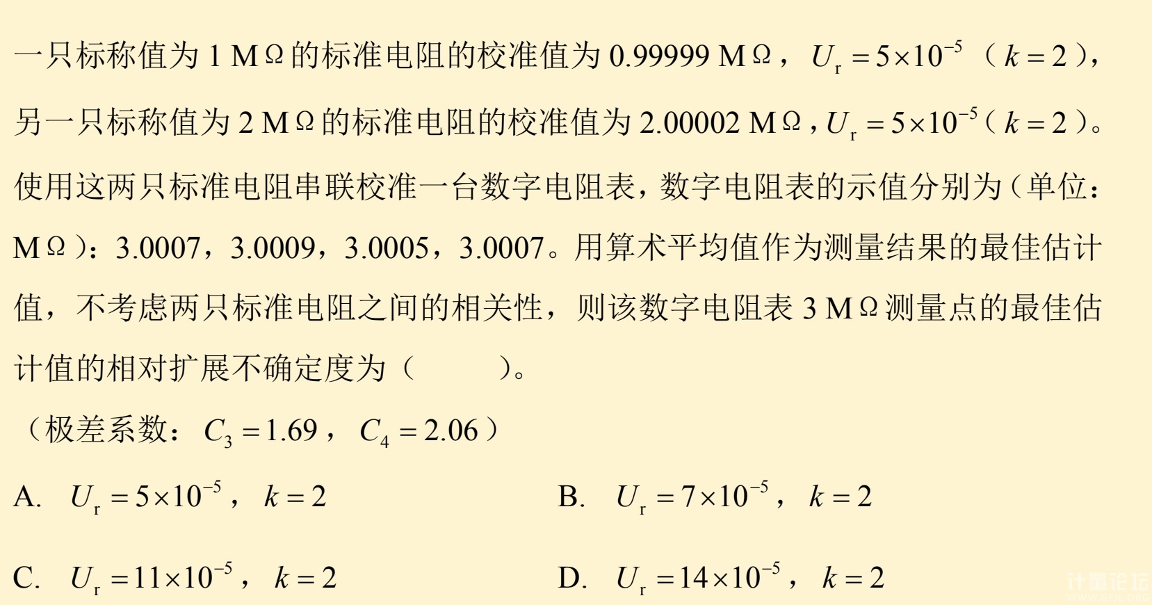 有沒有標(biāo)準(zhǔn)答案啊? 隨風(fēng)飄揚(yáng)用相對不確定度分量合成算出來的是相對擴(kuò)展不確定度是10×10-5 plcui用換算成絕對值的不確定度分量合成算出來的相對擴(kuò)展不確定度是7.47×10-5 如果選B,為什么用相對不確定度分量合成的相對擴(kuò)展不確定度不對? 或者說以上兩位解題方法都不對,有另外的解題方法? |