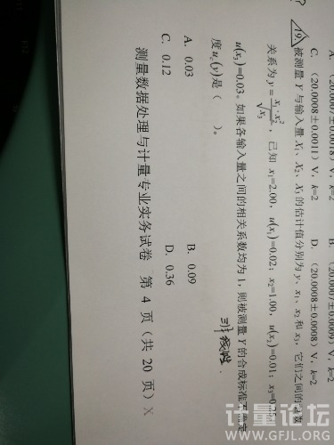 | 選c,先不說這道題本身是否錯誤,計算過程如下:題干說各輸入量間相關系數均為1,說明各輸入量間是正強相關,那么合成標準不確定度計算公式為:各輸入量的標準不確定度u(xi)乘以該輸入量的靈敏系數ci的代數和的絕對值,題干中,每個輸入量的標準不確定都是已知,只要把各靈敏系數算出來,結果就出來了,靈敏系數的計算方法不用說了吧,求導就行了,最后算出來就是0.12 |