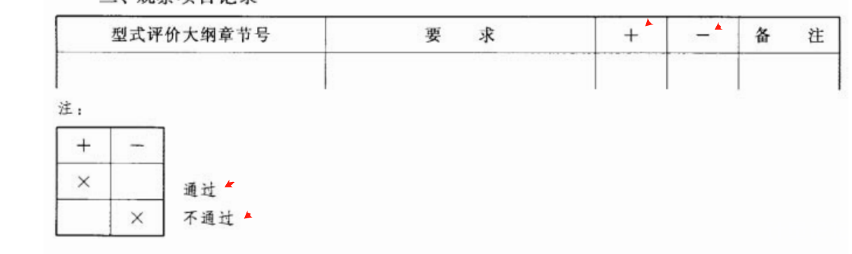 各位老師,這個型式評價表上面一欄的正負號什么意思呢? 還有就是怎么下面“+” 號一列打個“X”就表示合格么?合格怎么還打X叉號呢