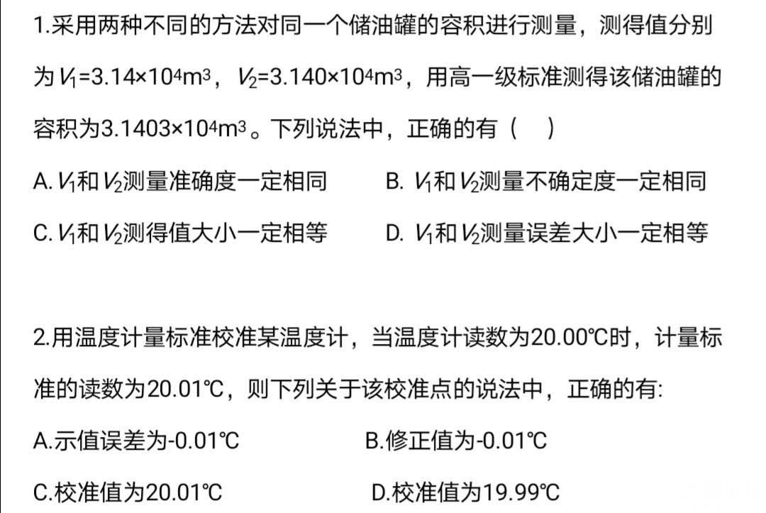 本帖最后由 moonkai 于 2020-5-18 09:03 編輯 我的答案,1、D 2 、A 第一題,V1和V2的測量結(jié)果有效數(shù)字不同,說明使用了不同準(zhǔn)確度等級的測量儀器,那帶來的后果就是測量結(jié)果的準(zhǔn)確度不同,不確定度不同,測量值不同,但是算誤差的時候,因為測量結(jié)果的絕對值是一樣的,所以誤差應(yīng)該是一樣的。 第二題,校準(zhǔn)值的說法沒有聽過,20.00攝氏度是示值,20.01攝氏度是標(biāo)準(zhǔn)值,示值誤差=示值-標(biāo)準(zhǔn)值=20-20.01=-0.01攝氏度,修正值=-示值誤差=0.01攝氏度 |
