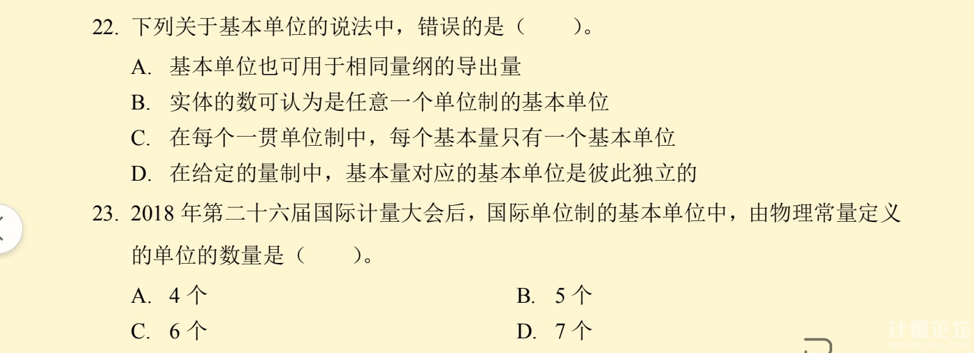 22,D。基本量是獨立的,但基本單位不一定(如長度單位米涉及到時間單位秒) 23,選D?這是哪兒的題還考這個?教材2017版的不會說18年的事兒。kg也取消實物基準了 |