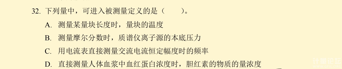 | 第32題,選A呀,因為量塊的長度因為熱脹冷縮會手溫度的影響,B、C、D中提到的都是影響量,可以在書上第106頁和JJF 1001-2011《通用計量術語及定義技術規范》上查到的 |
