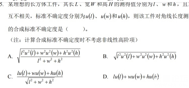 | 對角線測量模型(l^2+w^2+h^2)^1/2,三者互不相關,只需要求l,w,h各自的靈敏系數,分別為l/[((l^2+w^2+h^2)^1/2)]、w/[((l^2+w^2+h^2)^1/2)]、h/[((l^2+w^2+h^2)^1/2)],再利用ci^2ui^2求和開更號。 |