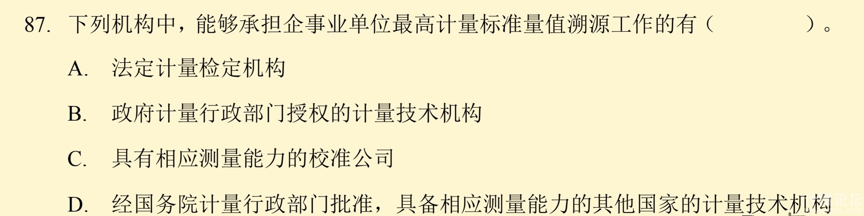 | 題目問的是能夠承擔計量溯源工作的,C和D經過計量授權,都是可以承擔計量溯源工作的,應該ABCD都是對的 |