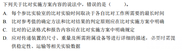 江魚979 發表于 2020-9-18 23:31 這個題應該選A吧,其他都沒啥毛病,A中 所用時間是主導實驗室安排的,參比實驗室說了不算。 |