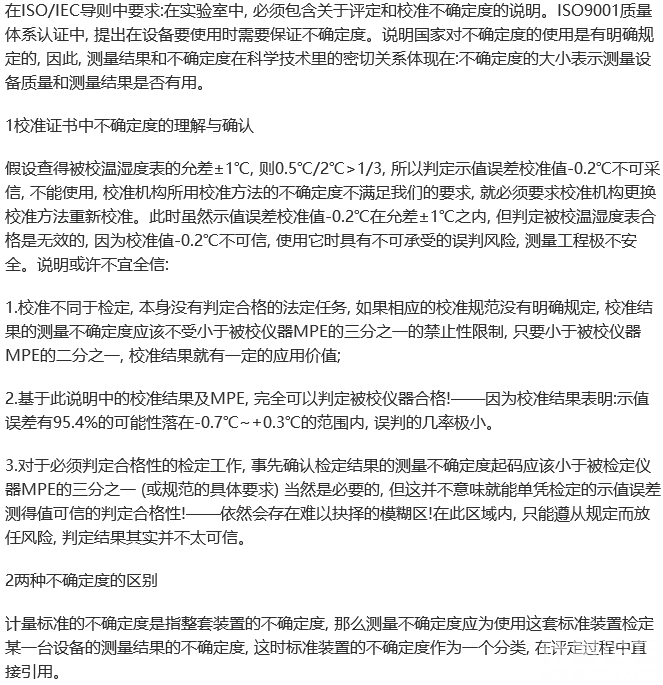 該文的這段話,個人覺得有值得商榷的地方。首先“0.5 ℃/2 ℃>1/3”就不知所云到底是在說什么。其次,《校準證書》給出的不確定度,是上級機構對被校對象進行校準所得到的“校準結果的不確定度”,也就是上級機構的“測量結果的不確定度”,而不是上級機構的“校準方法的不確定度”(或者說是“測量過程的不確定度”),后者應該是指上級機構的“校準和測量能力CMC”。 《校準證書》中給出的“校準結果的不確定度”是否小于被校對象最大允差絕對值MPEV的三分之一,不是用來判斷校準結果可不可信,而是上級機構用于對檢定/校準結果進行符合性判定時,是否要考慮“測量結果不確定度”的影響(見JJF1094-2002第5.3.1.4條和第5.3.1.6條)。而要求“校準方法的不確定度(或‘校準和測量能力CMC’)”≤1/3被校對象的MPEV,則是“量傳比”的概念,即是否滿足對被校對象開展檢定/校準的要求(見JJF1104-2003第6.8條)。 “校準結果的不確定度”不僅與所使用的計量標準的不確定度有關,還與被校對象自身的計量性能有關: