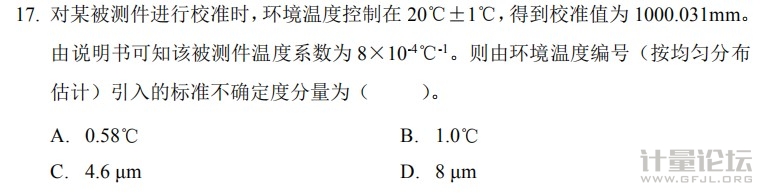看答案選項的單位是℃和μm,可知有兩種答案: ①溫度變化量 △=±1℃,所以區(qū)間半寬 a=1℃,按均勻分布 ,由環(huán)境溫度變化引入的標準不確定度為 uB=a/k=0.58℃。 ②直接計算溫度波動影響的校準值,校準值變化量△=±(1℃×8×10-4℃-1×1000.031mm)=±0.8mm,所以區(qū)間半寬a=0.8mm,按均勻分布,由環(huán)境 溫度變化引入的標準不確定度為uB=a/k=0.46mm。 本題答案:A |
