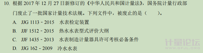 說說個人看法,這題可夠怪的。 先說題目,前面一段描述和問題是必然聯系嗎,沒有這段描述,應該也能做出判斷。 其次,選項B的規程代號我查出來是液相色譜儀型式評價大綱?這里應該是1522。 ABC選項我查到都是現行有效的,2017年修改刪掉的第22條是“未取得《制造計量器具許可證》、《修理計量器具許可證》制造或者修理計量器具的,責令停止生產、停止營業,沒收違法所得,可以并處罰款”,這應該不能說就是取消了制造許可制度,可能改由其他條款管理。 最后,D選項確實是廢止的,替代規程是JJG 162-2019,2020才開始實施,那么問題來了,這題是什么時候的呢? 綜上,這題我選不出答案,不知道這題出處在哪,但感覺并不是很嚴謹,做這種有時效性的題目也不太適合。 |