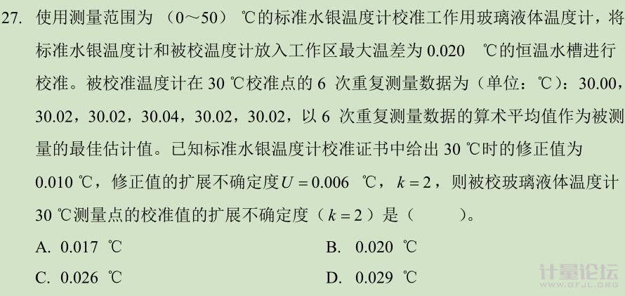 ikiwi 發(fā)表于 2021-5-11 17:26 我算下來結(jié)果是C。我對溫差引入的不確定度分量計算跟你不一樣,我認為最大溫差0.02度,也就是±0.02度,那它的區(qū)間半寬度應該是0.02度,不用再除以2。其他的不確定度分量與你一樣,U=2u=0.02579≈0.026 |