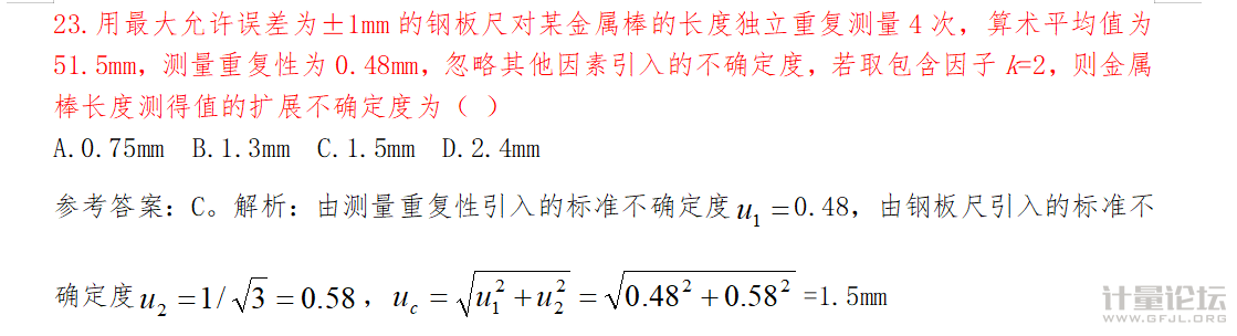 答案錯(cuò)了,應(yīng)該是1.3,選B。 注冊(cè)計(jì)量師官方從來沒有公布過試題和答案,網(wǎng)上的資料僅供參考。 不過該題如果在測(cè)量重復(fù)性前面加個(gè)單次,就比較完美了。 |