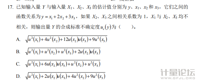 | 選A,用不確定度傳播公式,相關(guān)性那一塊,2*C2*U2*C3*U3*1 |