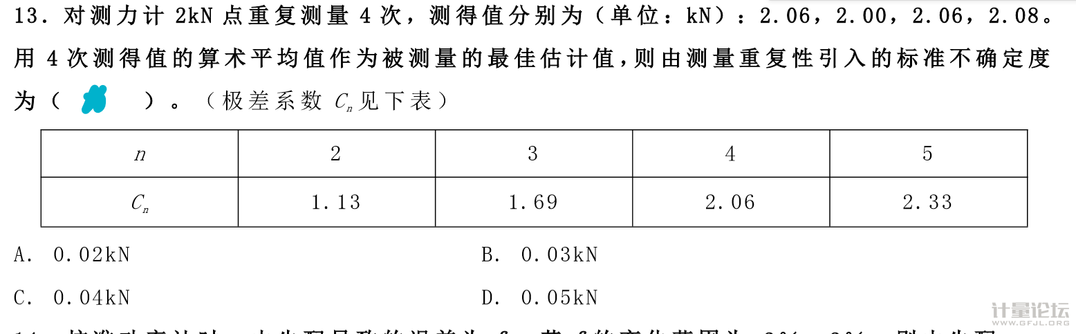 正文摘要:本帖最后由 761898 于 2021-5-18 18:31 編輯 答案是C,我選的A 反復算了好幾遍,(2.08-2.00)/2.06/2=0.02,選A,是我對重復性引入的不確定度有什么誤解嗎? |