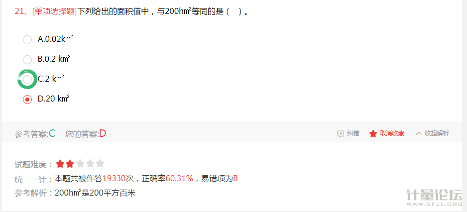 | 選“D”對,200hm2=(200*100)m2=(20*1000)m2=20km2 平方符號沒寫規范,大家原諒。h是100詞頭。 |