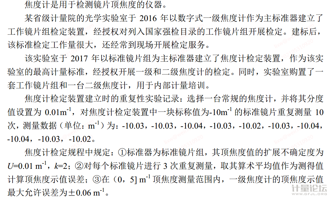 不可以 1.鏡片組屬于強制檢定器具,所以該計量院鏡片組檢定裝置屬于社會公用標準,社會公用標準應溯源至高一等級社會公用標準或基準。 2.個人認為,由于焦度計不在強檢范圍內,實驗室的焦度計檢定裝置經授權開展的一級二級焦度計檢定屬于非強制檢定,不適用1的溯源要求。 個人意見,僅供參考。 |