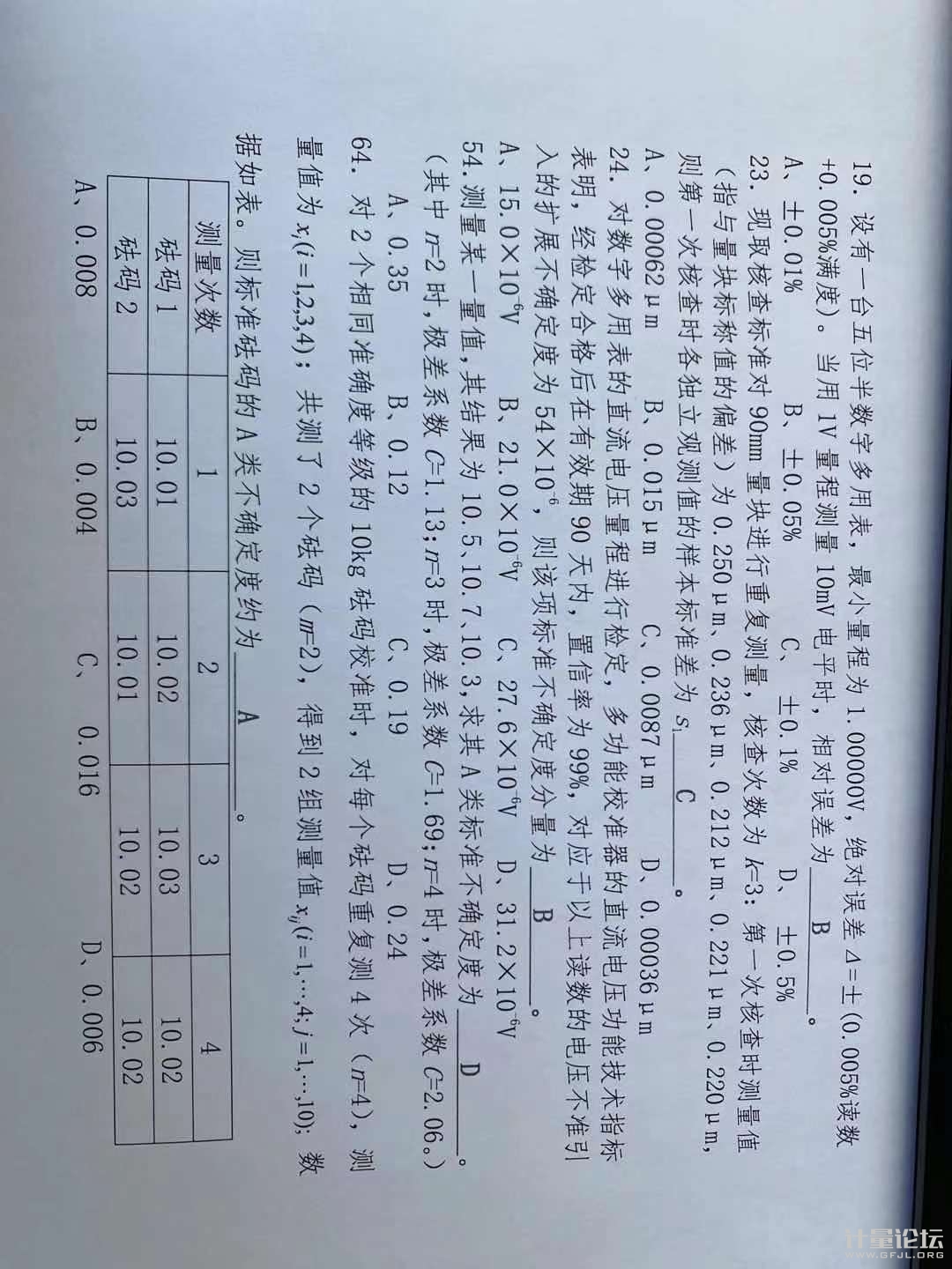 | 感謝各位大神指點,答案都是網上看來的。第54題,A類標準不確定度,在教材208頁寫的是s(x)除以根號n |
