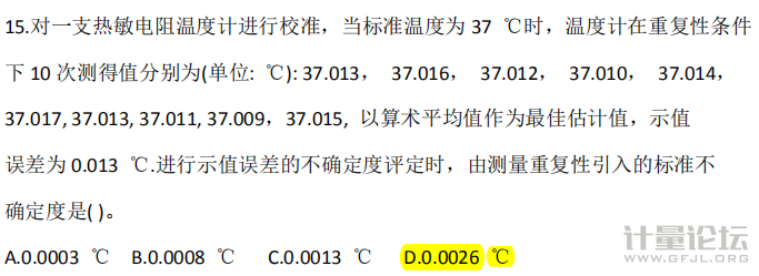 | 我覺得是B,測量重復性用標準差表示SX=0.0026,測量重復性引入的標準不確定度0.0026除以根號10=0.0008. |