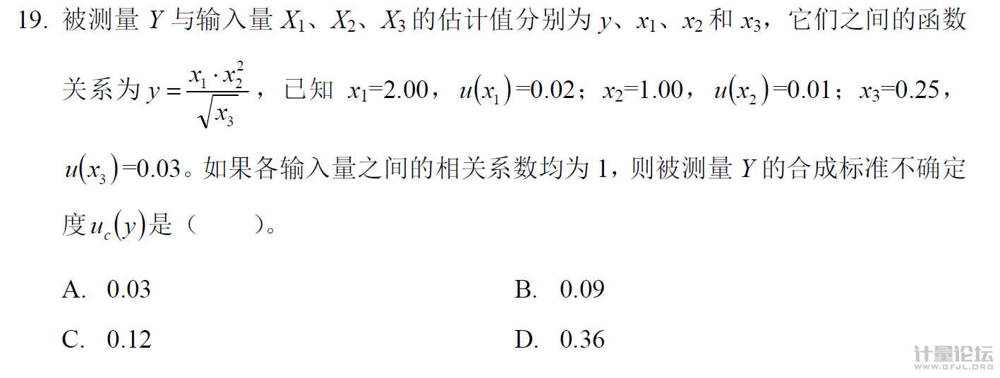 co4526 發(fā)表于 2021-6-18 15:45 選C,靈敏系數(shù)為-8,相關(guān)系數(shù)只是為1,并不是正相關(guān)(相關(guān)系數(shù)為+1)時,所以合成 標(biāo)準(zhǔn)不確定度為|0.12-0.24|=0.12 |