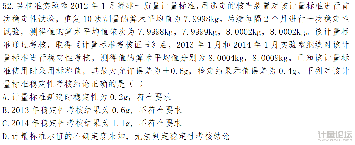 A計量標準新建標準的穩定性是0.4g B2013年穩定性考核結果是8.0004-7999.98=0.42g C2014年穩定性是0.5 D與示值的不確定度無關 |
