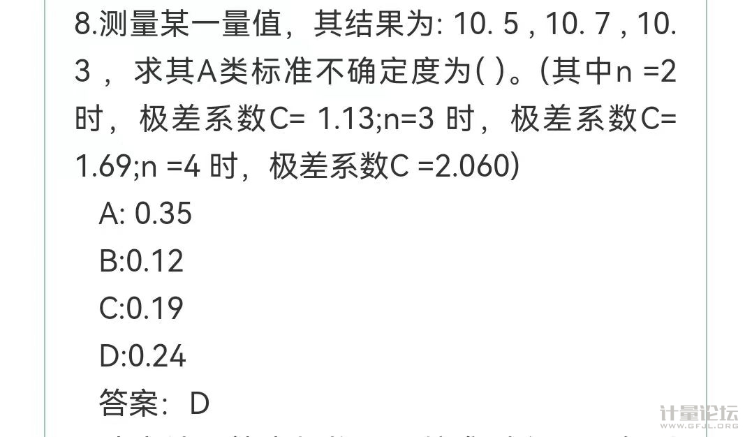 這種題目不是考試真題,出的不嚴謹。求A類不確定度,要明確測量結(jié)果按照哪個來計算的,如果是按照算數(shù)平均值,那要除以根號3,如果按照單次測量,除以根號1,也就相當于不用除。 這類題目建議你看看就好,不用細追,題目出的很不嚴謹。 |