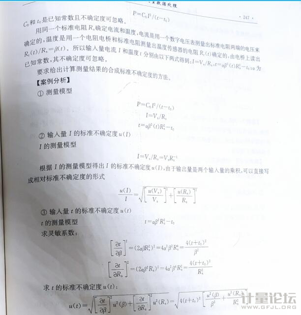 回復樓主: 你的第一個問題:理論上計算合成標準不確定度時應該考慮計算協方差項。但在本例中,輸出量溫度t只有兩個輸入量β和Rs(常數項如果不是無理數就沒有不確定度),因此t的標準不確定度就只有兩個分量,一個由輸入量β引入,另一個由輸入量Rs引入。兩個輸入量分別取決于兩個不同的測量設備,其中輸入量Rs取決于“標準電阻”,輸入量β取決于“電橋”,兩個輸入量分別取決于兩個不同測量設備的讀數,兩個標準不確定度也就分別取決于兩個不同測量設備的計量特性,因此可視為不相關或弱相關,合成時也就可以不考慮相關性,不考慮協方差項。 你的第二個問題:輸出量P有兩個標準不確定度分量,分別由輸入量I和輸入量t引入。輸入量I與輸入量t的大小都需要使用同一個測量設備“標準電阻”,只不過計算方法不同而已,因此兩個輸入量分別給輸出量引入的標準不確定度分量都與標準電阻的計量特性相關,在計算合成標準不確定度時,這就需要考慮相關性和協方差。因為計算比較繁瑣,我實在沒時間詳細計算驗證,請你自己以輸入量t為例,先對P的測量模型全微分,計算出輸入量t的靈敏系數Ct=?P/?t,評估出輸入量t的標準不確定度u(t),再計算出輸入量t給輸出量P引入的標準不確定度分量u(P1)=Ct·u(t),最后再計算出標準不確定度分量Ct·u(t)的相對標準不確定度,驗證一下結果里面應該是t+t0,還是t-t0。 |