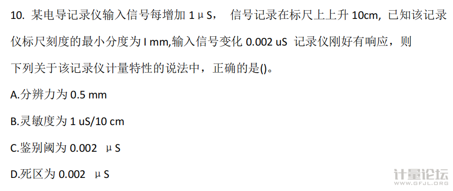 | 排除法,首先A、肯定錯了,因為分辨力指的是儀表的特性,用儀表的計量單位來表示,而不是用標尺間距來表示。B、肯定錯了,靈敏度是“測量系統的示值變化除以相應的被測量值變化所得的商。”就是輸出比輸入,題目中給出,標尺間距1mm和輸入1μs輸出10mm的條件,則靈敏度為一百分之一us比1mm,等于0.01μs/mm。P111,他用輸出量(響應)的增量與相應輸入量(激勵)的微小量之比來表示,注意,是微小量。D、肯定錯誤,因為死區是雙向的。C、正確。P113,鑒別閾是指“引起相應示值不可檢測到變化的被測量值的最大變化。”在實際操作上,對指針式測量儀器,常采用引起相應示值可檢測到變化的被測量值的最小變化作為鑒別閾。 |