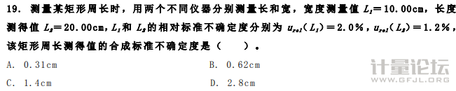 | 周長C=2*寬+2*長,故系數c寬=c長=2;u寬=10.00*2.0%=0.2cm,u長=20.00*1.2%=0.24cm,合成標準不確定度uc=根號下[(2*0.2)的平方+(0.24*2)的平方],故結果為0.62cm |
