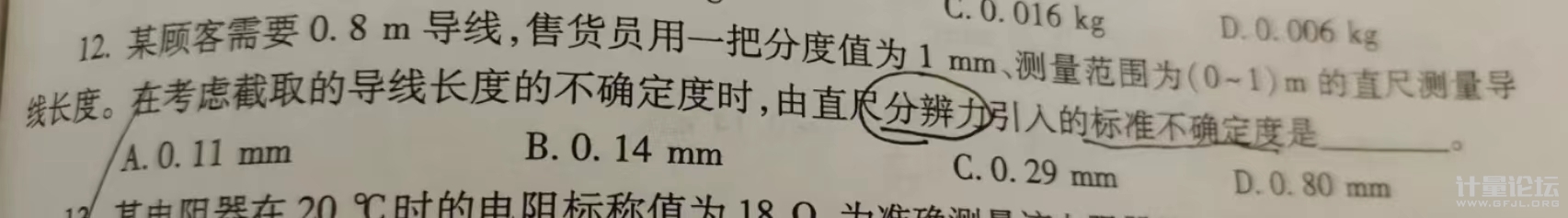 正文摘要:第一個題是書的配套的題目,第二題是準題庫的題目,都是根據分度值算分辨率,再計算b類不確定度。準題庫的模擬式就是分辨率就是半寬度,書上的題目就是模擬式還是數字式的半寬度都是分辨力的一半,是不是準題庫的題 ... |