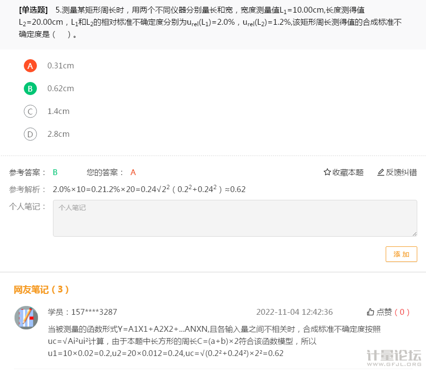 | 朋友,每道題的后面都有網友筆記,已經解釋的很清楚了!根據測量模型往對應的合成不確定度公式套就行 |
