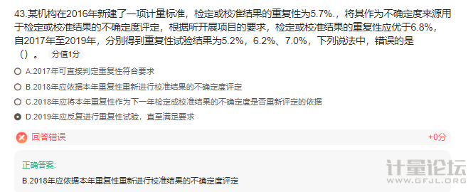 | “如果測得的重復性大于新建計量標準時測得的重復性,則應當依據新測得的重復性重新進行檢定或校準結果的不確定度的評定。”書本原話,我也覺得D錯 |