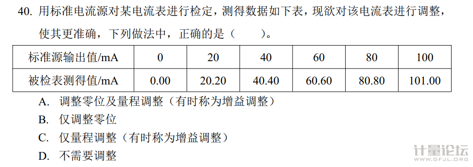 | 我調(diào)試過一些設(shè)備,大部分只能線性調(diào)整,稍微高級的可以調(diào)幾個點,通過調(diào)整點位的數(shù)值重新計算斜率,比如實際是1,顯示0.8,實際是3顯示2.4,可以通過調(diào)整使顯示值與實際值一致或大體相同。如果實際值是2,顯示值是1.8,調(diào)整后顯示值就是2.2,不再顯示2.0,同理0點也隨線性變化而變化。單點調(diào)節(jié)的設(shè)備并不多,因為設(shè)計過于復(fù)雜,有個別整數(shù)值點準(zhǔn)確,但區(qū)間值變差的風(fēng)險。所以我感覺這道題是想考線性調(diào)整后,斜率或截距變化,導(dǎo)致零點變化,只能再調(diào)零,雖然還是有誤差,但比未調(diào)整時要準(zhǔn)確的多。 |