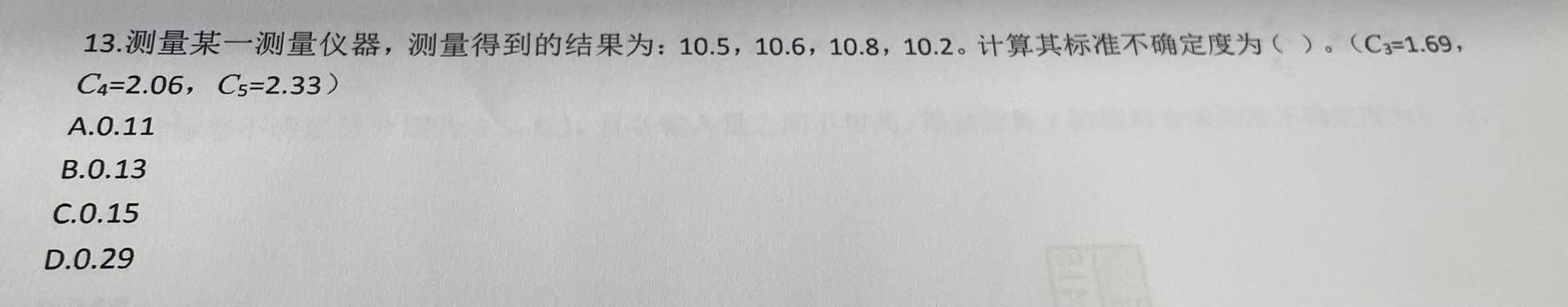 | 應該選C,用A類不確定度評定方法計算,實驗標準偏差用極差法計算后再除以根號4,得出標準不確定度的值。 |